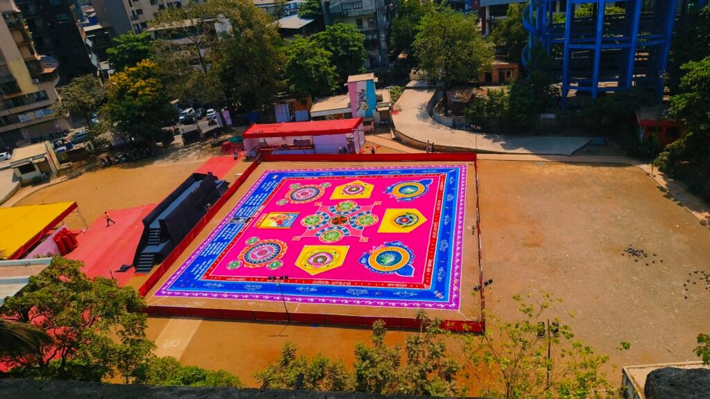 २५ वर्षांपासून ही परंपरा जपली जात आहे. यंदाची रांगोळी तब्बल ९० फूट बाय ९० फूट आकाराची आहे. यासाठी २५० किलो रांगोळी आणि ५०० किलो रंगाचा वापर करण्यात आला आहे. या महारांगोळीत भारत मातेची आकर्षक प्रतिमा, बंकिमचंद्र चट्टोपाध्याय यांचे चित्र, ‘वंदे मातरम्’च्या ओळी तसेच भारतीय संस्कृतीतील स्वस्तिकासारखी शुभचिन्हे रेखाटण्यात आली आहेत. त्याचबरोबर भारताच्या संविधानाची ७५ वर्ष पूर्तता या विषयावर चित्र प्रदर्शन मांडण्यात आले आहे. यासोबतच मैदानात भारतीय संविधानातील कला आणि सुलेखन, युनेस्कोच्या जागतिक वारसा यादीतील १२ किल्ल्यांच्या प्रतिकृती, छंदोत्सव आणि फोटो सर्कलच्या गुढीपाडवा उत्सव अशा विविध विषयांवर प्रदर्शनांचे आयोजन करण्यात आले आहे. या प्रदर्शनांचे उद्घाटन महापौर शर्मिला पिंपळोलकर यांच्या हस्ते करण्यात आले. छंदोत्सव ग्रुुप मुंबई तर्फे विविध छंदवस्तूंचे प्रदर्शन मांडण्यात आले असून यामध्ये कागदापासून तयार केलेल्या वस्तू आहेत.